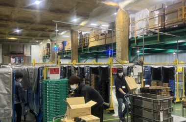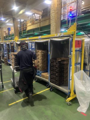 ピッキング完了後、カゴ台車が満タンになったらカゴ車をトラックへ積み込み出来るようバース近くに移動させ、新しいカゴ台車をセットします。